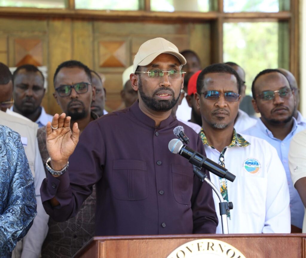Mandera County leadership led by Governor Mohamed Khalif address the media following the County Steering Group (CSG) meeting on the drought response.